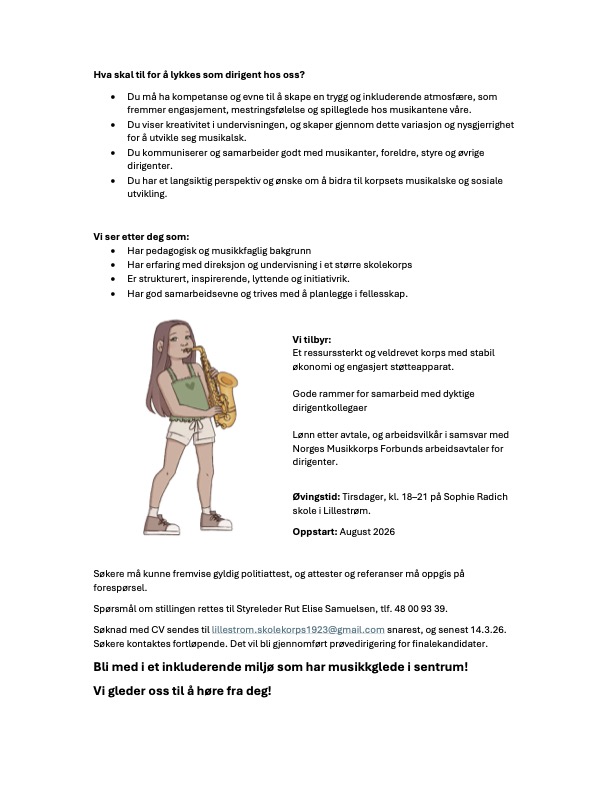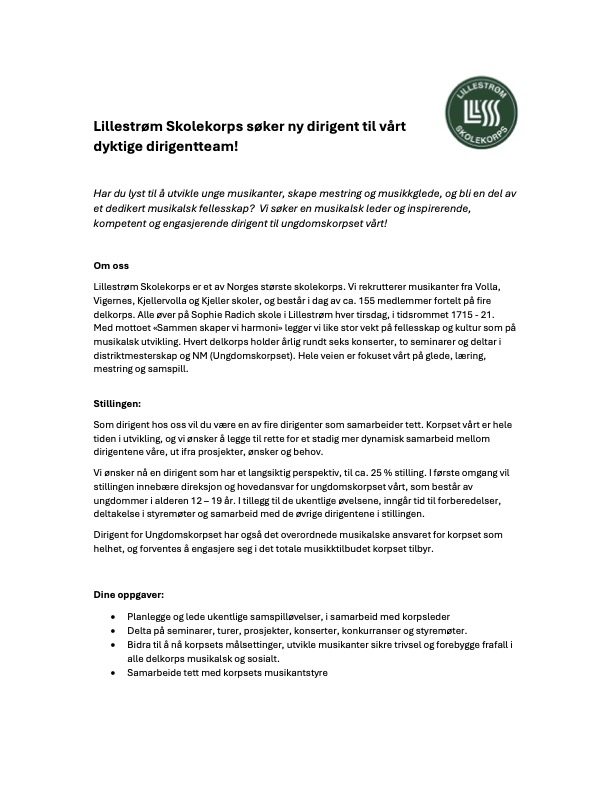 Lillestrøm Skolekorps søker ny dirigent til vårt dyktige dirigentteam! Har du lyst til å utvikle unge musikanter, skape mestring og musikkglede, og bli en del av et dedikert musikalsk fellesskap? Vi søker en musikalsk leder og inspirerende, kompetent og engasjerende dirigent til ungdomskorpset vårt!